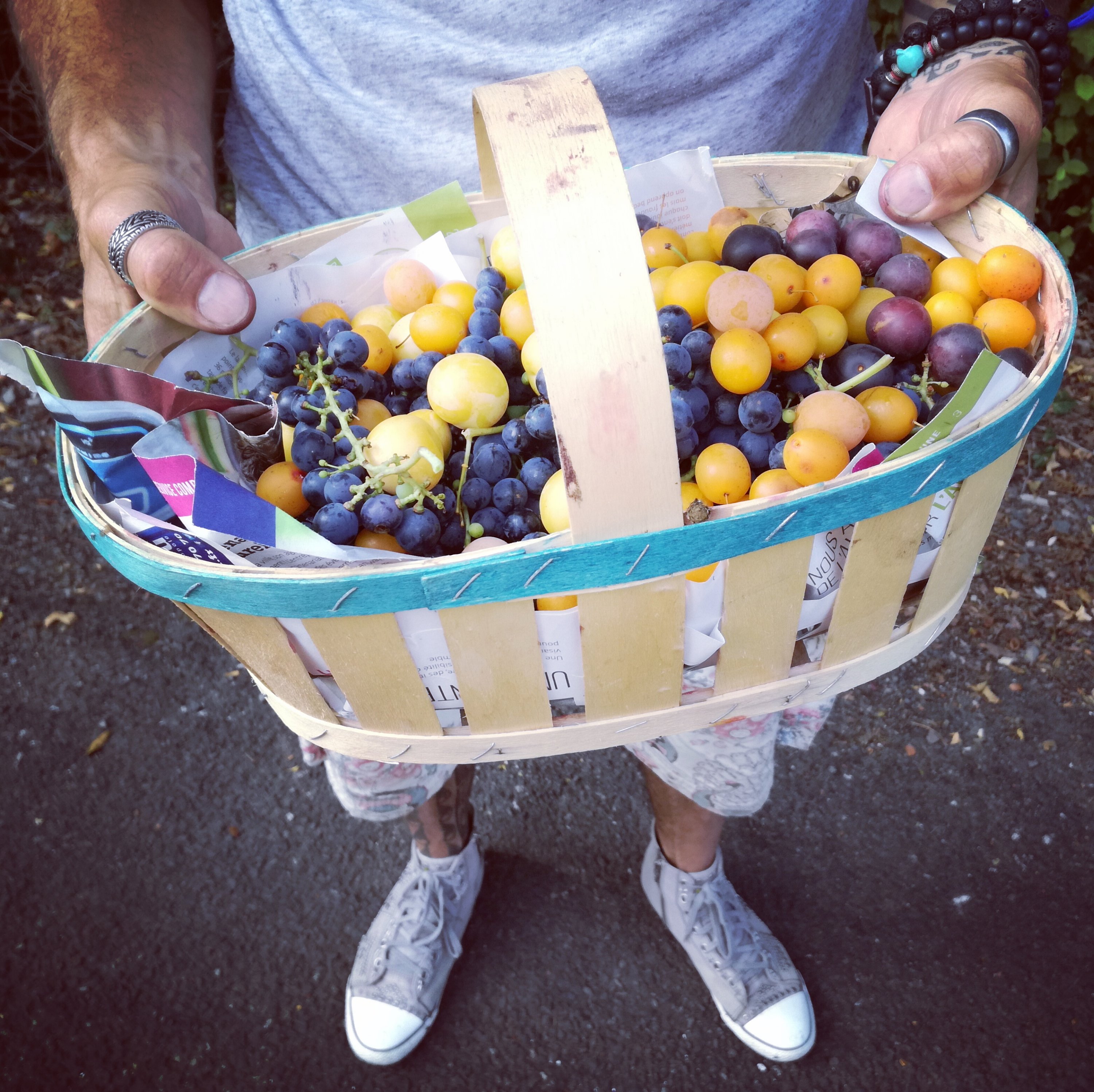 Een man met lange baard. Mouw en kuit tattoo. In de hand een mand vol natuurlijke lekkernijen. Abrikozen, druiven, mirabellen, pruimen…een korte babbel. Het contrast van zijn kledij en handelingen, waar zijn grote handen de kleine vruchten opraapt, vind ik zo lief en vertederend te zien. Een vrouw spreekt me aan, ‘ je vous admire’. Een babbel installeert zich. Woorden vloeien vanuit een vanzelfsprekendheid, vanuit het niets. Het voelt aan alsof de woorden van heel diep komen. Ontstaan vanuit puurheid alsof iets me gaat leiden zonder ik er enige moeite voor doe. Een mama met twee kinderen nodigt me zomaar uit bij haar op de koffie. De ene aangename ontmoeting na de andere.