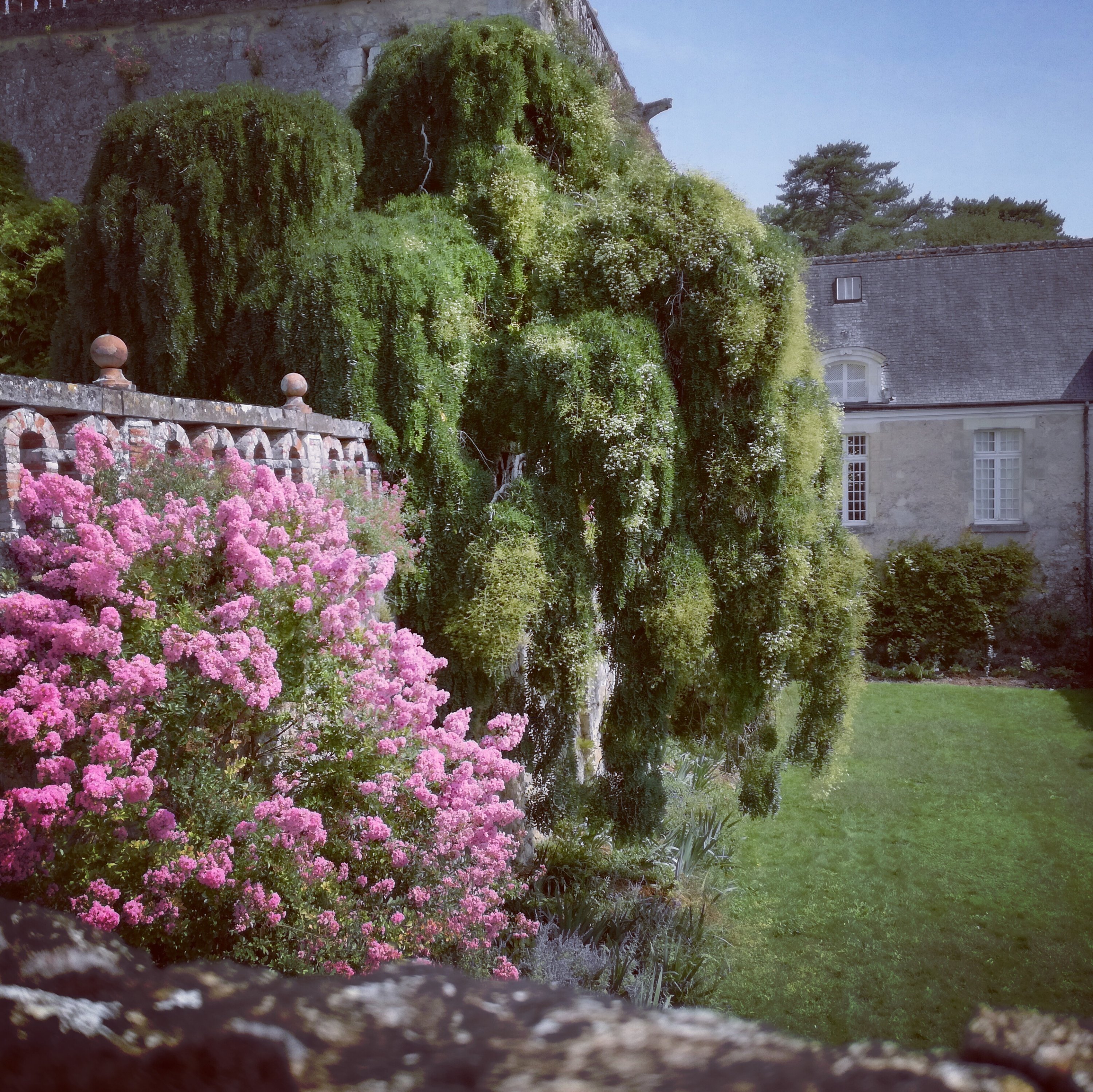 Een halte in het kasteel van Valmer. Een hartelijke ontvangst. Een bezoek aan haar tuinen en haar kapel in een troglodytique. De enorme thuya trekt mijn aandacht. Ik zie me hier wel logeren en tuinvrouw zijn. Een toerist komt melden dat de kippen geen water hebben. De bezoekers eisen de aandacht van de gastvrouw, waardoor de vrouw niet weet hoe water te gaan geven. ‘Je peut donner de l’eau madame si cela ne vous ennuit pas’, zeg in tegen de vrouw. ‘Oh’, verwonderd kijkt ze me aan, ‘vous voulez faire ça!’ Een half uur later sta ik in de kippenren water te geven aan de kippen – de vrouw noemt ze ‘les poules de luxe’. Nooit gedacht dat ik ooit in een kasteel water zou geven aan de dieren en me zo huiselijk zou ontvangen worden. Hoe verleidelijk het ook was om hier te overnachten na een uitnodiging, koos ik ervoor om mijn weg verder te zetten. ‘Je reviens l’annee prochaine si tous ce passe bien en retour de Assise, Rome et Saint-Jacques.’ Ik steek mijn hand om en verdwijn in de verte.