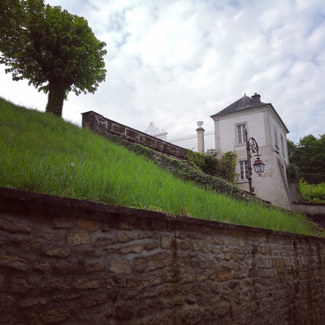 Al neuriënd verlaat ik de stad met zijn kasteel die nu een psychiatrisch ziekenhuis is. Het deuntje volgt me een lange tijd. Mij stokken zwieren vrij wat nonchalant naast meheen. Ik geniet van de ochtendfrisheid na een korte regenbui. Via een rustige (omdat ik geen aandacht schenk aan de weinige wagens) departementale om verder de GR route terug op te nemen. De tuinen staan in hun lente bloei. Kruiwagens, harken… Vers omgeploeterde siertuinen. Ik geniet van het zien hoe mensen hun tuin omploeteren en in contact zijn met de aarde. De moestuinen die er piekfijn bij staan en klaar zijn om de groenten te laten groeien.