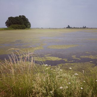 De weg gaat verder via de rijstvelden. In plaats van op gelijke hoogte te wandelen met de velden, wandel ik nu op een verhoogde berm. Dit best wel aangenamer en kan ik daardoor genieten van de reflecties op het water. De fris groene kleur staat prachtig met het blauw van de hemel.