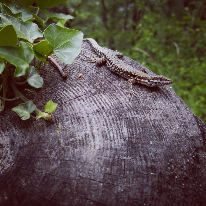 Waar de mast van de naaldboom steun gaat bieden aan de takken van de loofboom. Als broeders bij en met elkaar. Wat hebben we veel te leren aan de natuur. Een hagedis laat het toe dat ik heel dichtbij kom.