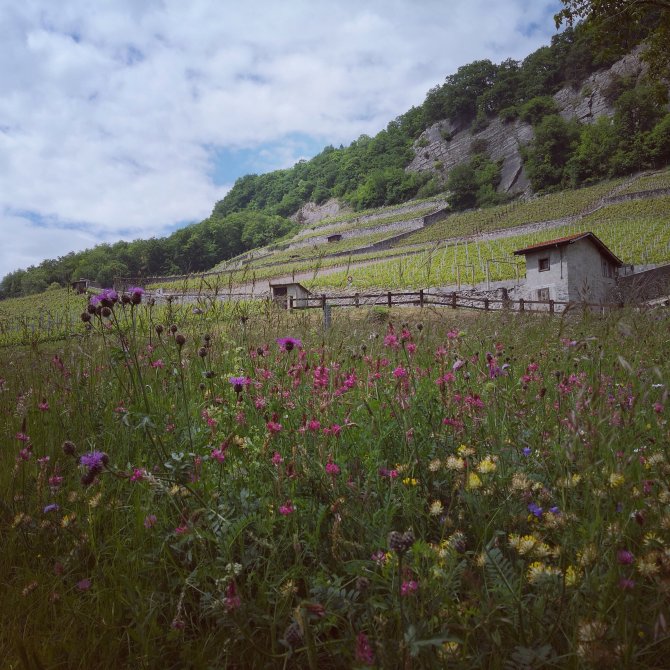 Een man staat voorovergebogen en haalt het onkruid van onder de bessenstruik. Zachtjes wandel ik voorbij om hem niet te laten schrikken. Eenmaal voorbij voel ik zijn beweging, hij recht zich “Je croyais que je vous aller faire saisir”, zeg ik aan de man. “Je suis un peut sourd d’oreille”, vertelt hij me. Hij kijkt verwonderd op wanneer ik hem vertel over de weg die neem. Het maakt hem sprakeloos. We praten over de inwoners, het werk, de wijngaarden. Over zijn herkomst, zijn huis. Hij kwam hier voor de bouw, “… Si non il habiterais encore dans des cabanes en bois…” vertelt hij (niet bewust van wat hij zegt).Waarom gaan mensen zich beter achten dan de anderen… !? Wat hou ik van ‘les cabanes en bois’.