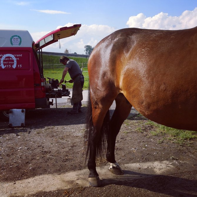 Een getik… Een man op zijn knieën… Le Maréchal Ferrand. Ik blijf een eind bij hen en zie hoe hij de hoefijzers verwijderd. De poten met veel zorg verzorgt en met liefde voor het vak het paard benaderd.