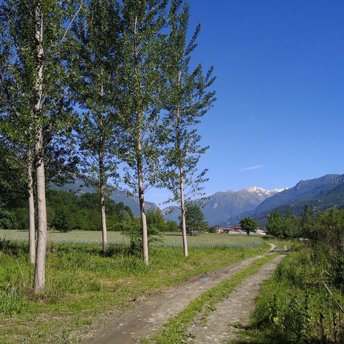 Via een Populieren bos – die het goed doet op vochtige gronden – verlaat ik Borgofranco. De frisheid die het bos met zich meebrengt is deugddoend. Het verschil in temperatuur is duidelijk voelbaar en hoger bij het afdalen in de vallei. De uitlopers van de bergen zijn vochtig. Verschillende meren zijn aanwezig in de streek. Aan het meer of Lago in het Italiaans ‘Pistino’ neem ik de langere weg rond het meer en ik betreur het me niet. De vergezichten en openhemel schenken me een prachtig zicht.
