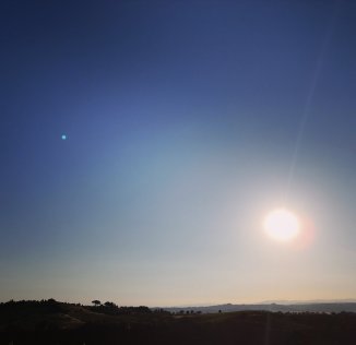 Een warmkleurige opkomende zon…de aarde kleurt werkelijk Sienna…