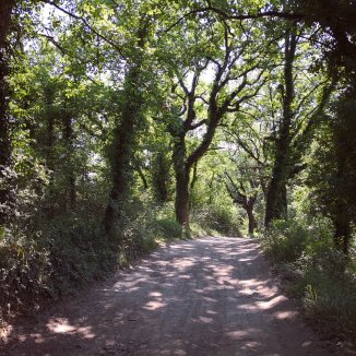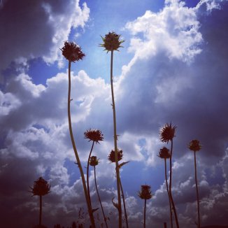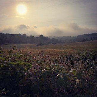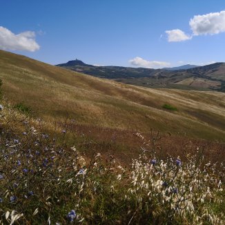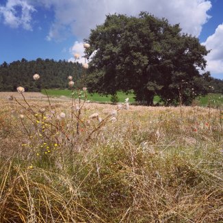 Vlinders fladderen om me heen. Voetsporen van everzwijnen. Korenbloem. Een veld van zonnebloemen. Het gekraak van een haan.