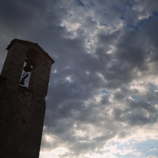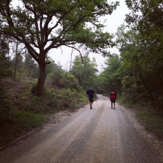 Ondertussen bijna tien kilometer in stijgende richting door bossen, langs velden… Mijn krachten geraken op… Eenmaal boven nog een drie kilometer in dalende richting naar Abbadia San Salvatore. Het onweer is opkomst… we beslissen om de weg te nemen en nemen geen risico. Aan de andere kant van de weg staat een wagen. “Tu vois la… Une voiture, elle nous attend”, zeg ik tegen Jean-Paul. Een man stapt uit en vraagt of we naar de Ostello gaan. Net op tijd… het onweert.