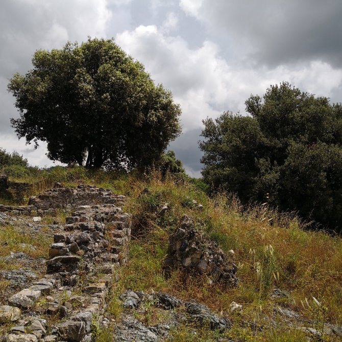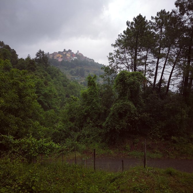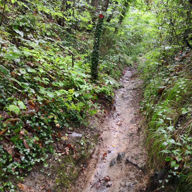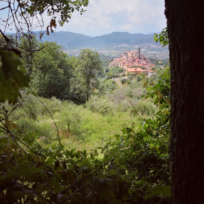 Een blaffende hond komt naar me toe. Oh… hij gaat voor me lopen en aan iedere hoek blijft hij staan… hij toont me de weg… Plots verdwijnt hij op een terras. Ik draai me om “Grazie” roep ik hem toe. Zonder hem had ik inderdaad de smalle stijgende weg tussen het groen niet gezien.