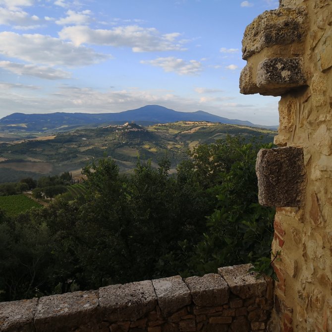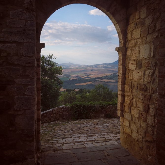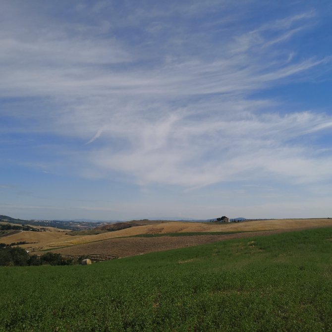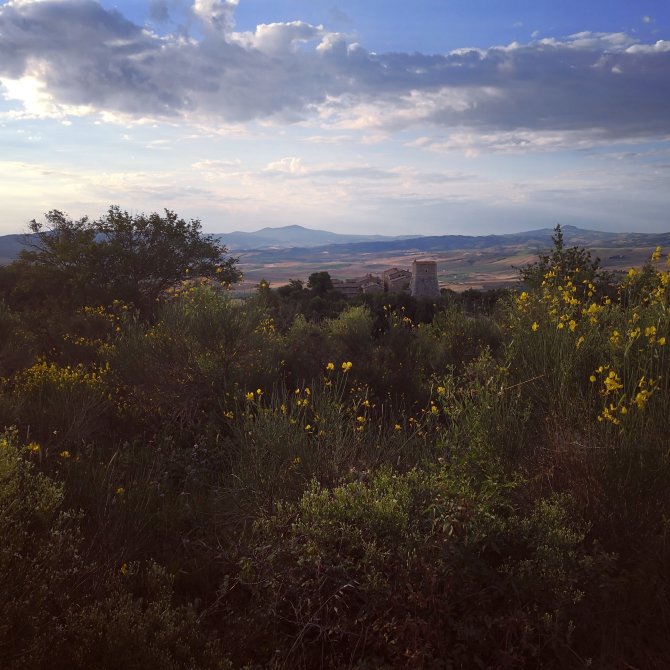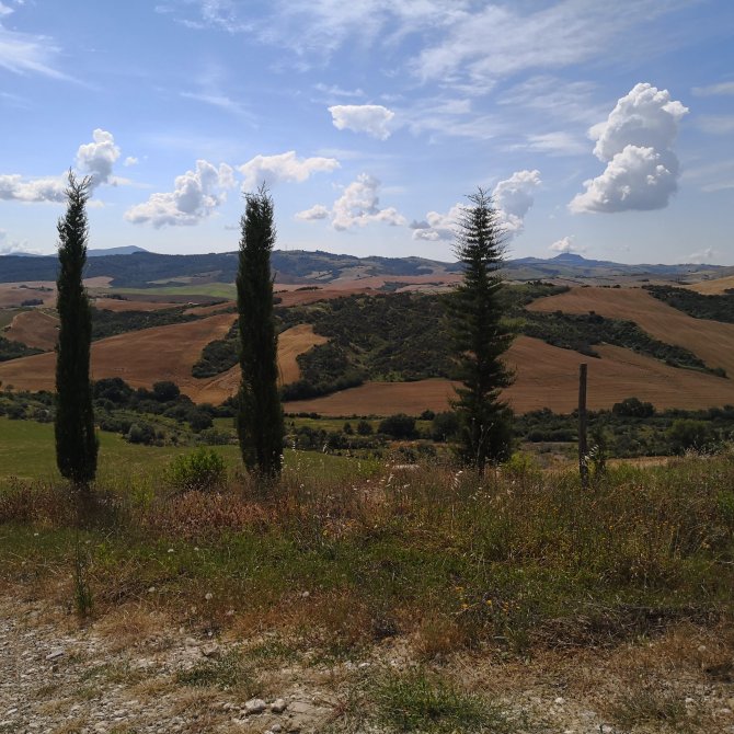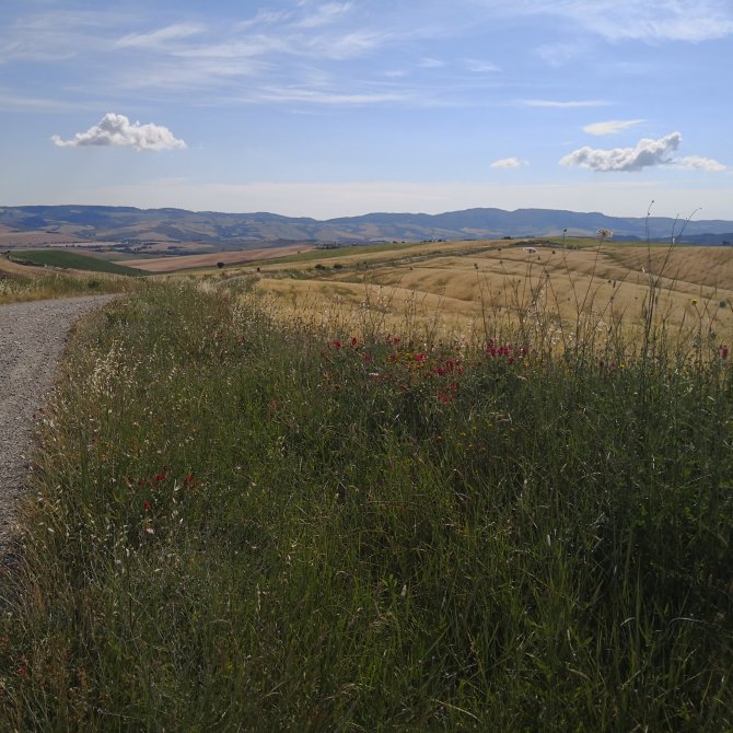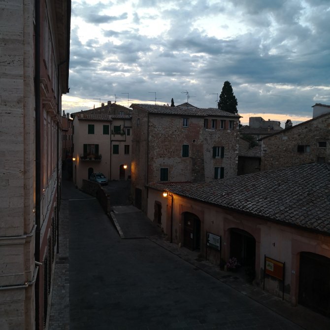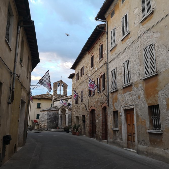Ik open het raam van de kamer… De straat lampen zijn nog aan. Kleine wolken hangen boven San Quirico d’orcia. Samen met Jean-Paul verlaat ik het dorp. Een lange tocht staat ons te wachten… 33 km richting Abbadia San Salvator.