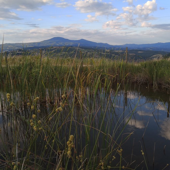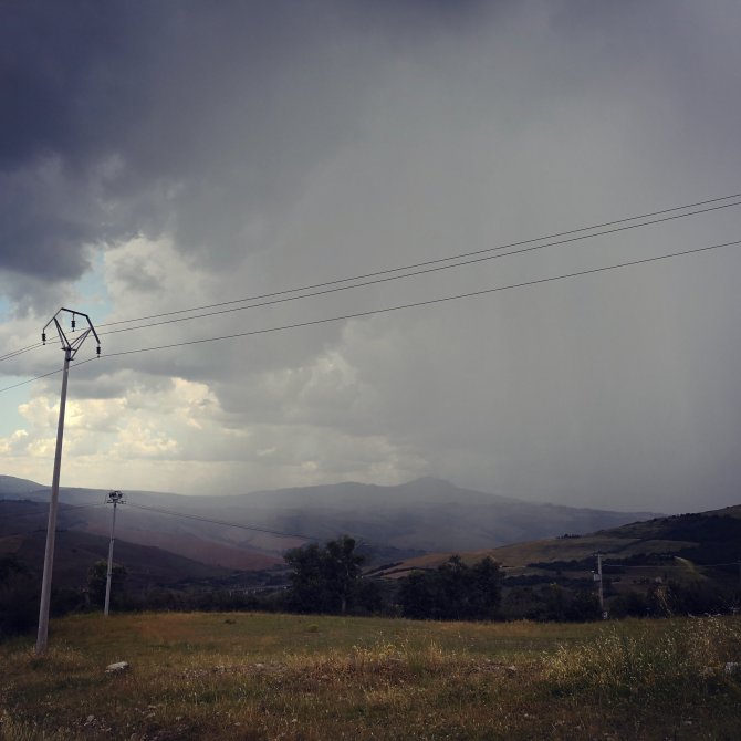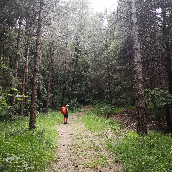 Ondertussen bijna tien kilometer in stijgende richting door bossen, langs velden… Mijn krachten geraken op… Eenmaal boven nog een drie kilometer in dalende richting naar Abbadia San Salvatore. Het onweer is opkomst… we beslissen om de weg te nemen en nemen geen risico. Aan de andere kant van de weg staat een wagen. “Tu vois la… Une voiture, elle nous attend”, zeg ik tegen Jean-Paul. Een man stapt uit en vraagt of we naar de Ostello gaan. Net op tijd… het onweert.