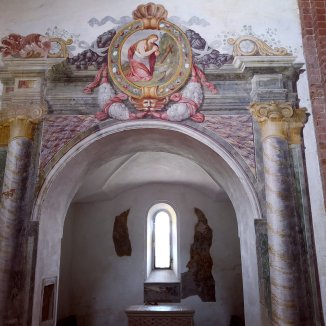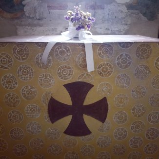 In de Abdij van Chiaravalle della Colombia, cisterciënzer klooster geniet ik van de grote eenvoudige abdijkerk, binnentuin, kloostergang. Vier kapellen vooraan één voor Petrus en Paulus, Benedictus, Stephanus en Maria Magdalena. In het midden werd een lang tapijt met bloemen gecreëerd, typisch voor de regio Emilia-Romagna.