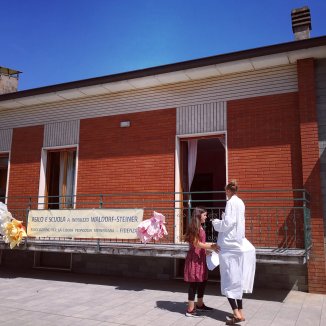 Ik hoor kinderen. Een school. Ik vraag of ze mij kunnen helpen met wat water. De kinderen zijn een toneelstuk aan het spelen met aangepaste kledij en in het Engels. Het toneelstuk heet… jaja… ‘Roméo en Julia’. Op de achtergrond een wit doek waarop Steiner opstaat. Een school, in een huis, midden de heuvels, een klas van vijf leerlingen… Waw.