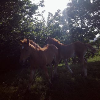 Een paar bellen zijn terug hoorbaar… Hetzelfde geluid als gisteren… ja hoor boven op een heuvel een kudde paarden met hun veulens.