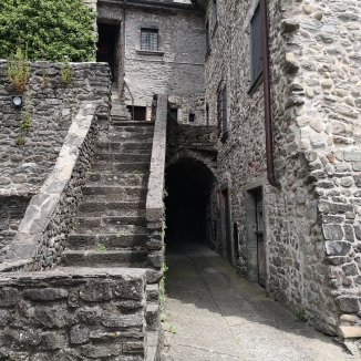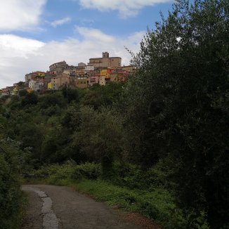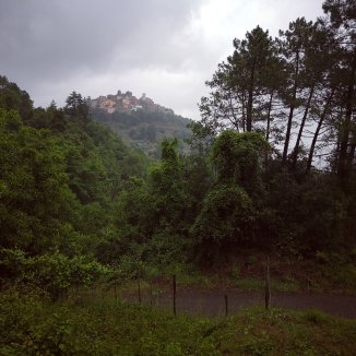 Een blaffende hond komt naar me toe. Oh… hij gaat voor me lopen en aan iedere hoek blijft hij staan… hij toont me de weg… Plots verdwijnt hij op een terras. Ik draai me om “Grazie” roep ik hem toe. Zonder hem had ik inderdaad de smalle stijgende weg tussen het groen niet gezien.
