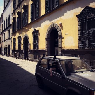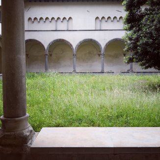 In Santissima Annunziata laat ik me verleiden door een open deur. Een donkere gang om nadien uit te komen in een kloostergang. Twee kloostergangen, twee binnen tuinen. Geen kat te bespeuren. Achter een raam een massa oude archiefbeelden gestapeld op elkaar. Stof en spinnenwebben hebben hun plaats ingenomen. Waw… En dit staat leeg zonde. Ik zie het al voor me. De ene kant een woongebied de andere kant werkruimte waar handenarbeid wordt verricht, ruimtes voor lichaam en geest. De binnentuinen, de een groenten tuin, de ander fruitbomen. Mijn fantasie slaat op hol.