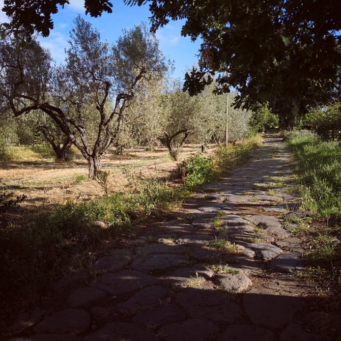 Met zanderige wegen kom ik aan in Viterbo. Een drukte van jewelste… Overal wagens. Het is warm… Ik wandel erdoor richting Vetralla… een lange weg. Geen schaduw, zand.