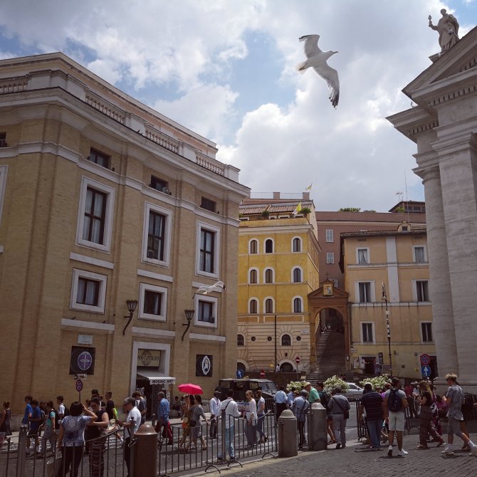 Mijn ademhaling… Ander ritme… . We zeggen geen woord… We naderen… En plots staan we op het Vaticaanplein…groots, euh eerder immens… Te groot… Ontroerd van het aankomen in Rome, het eindpunt van de VF, niet een eindpunt. Van België, over Frankrijk, via Zwitserland, Italië in… 2160km te voet. Ik voel dat ik me even wil afzonderen… Mijn telefoon… mijn metekind… het antwoordapparaat…ze belt me terug…