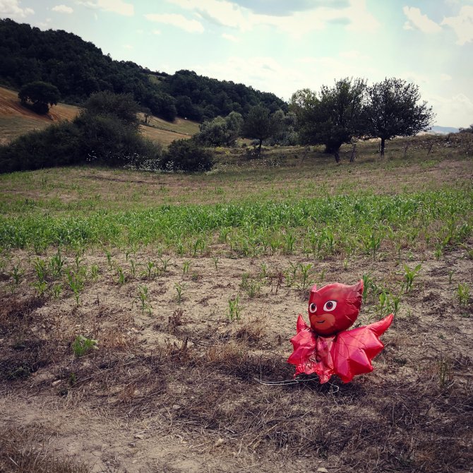 De wegmarkeringen zijn verloren gegaan of onder de honderden slakken of ergens diep in het hoge gras. In de verte een rode ballon, zou dit een weg markering zijn, stel ik me de vraag. Waarschijnlijk niet… een verloren ‘Cato boy’ midden de velden. De paar meters zijn me teveel om er naartoe te gaan en er een beeld van te nemen. Wat eigenlijk wat vreemd is dit hier te vinden.