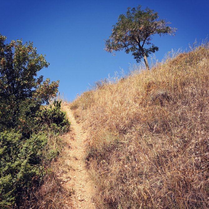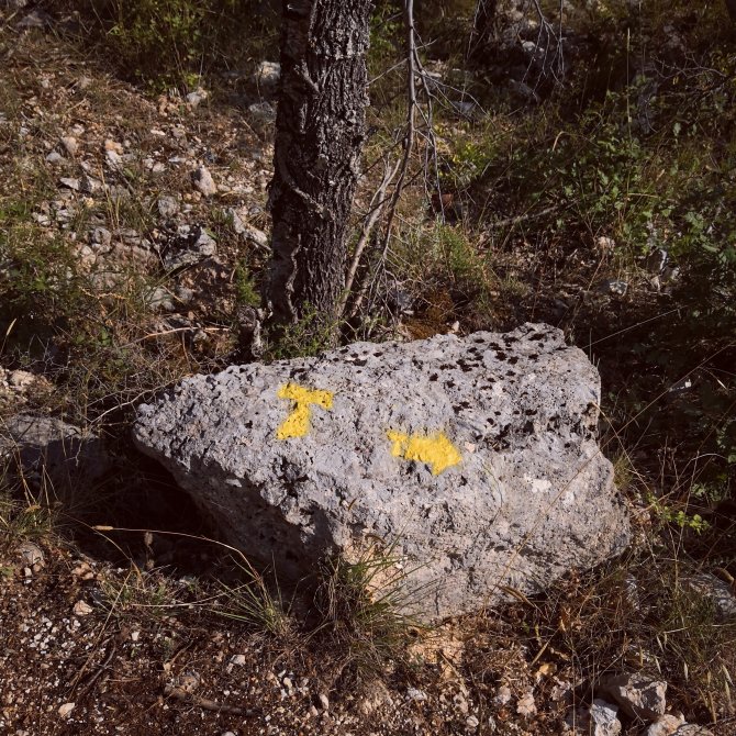 De eerste dag dat ik de Tau samen met een gele pijl mag zien. Deugddoend… Net als de rood-witte strepen of andere signalisaties bv stikkers hebben een grote waarde voor de pelgrim of wandelaar. Voor mij zijn ze symbool als verbinding van mens tot mens en niet enkel materie. Drie kilometer lang wandel ik in stijgende lijn op een duidelijk pad. Stap voor stap… met volharding… Hmmm, volharding klopt eigenlijk niet, uithouding in volzachtigheid.
