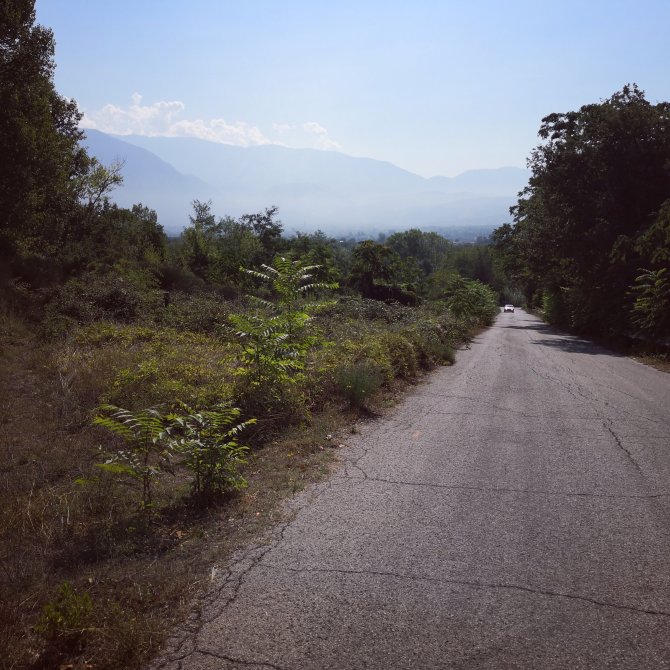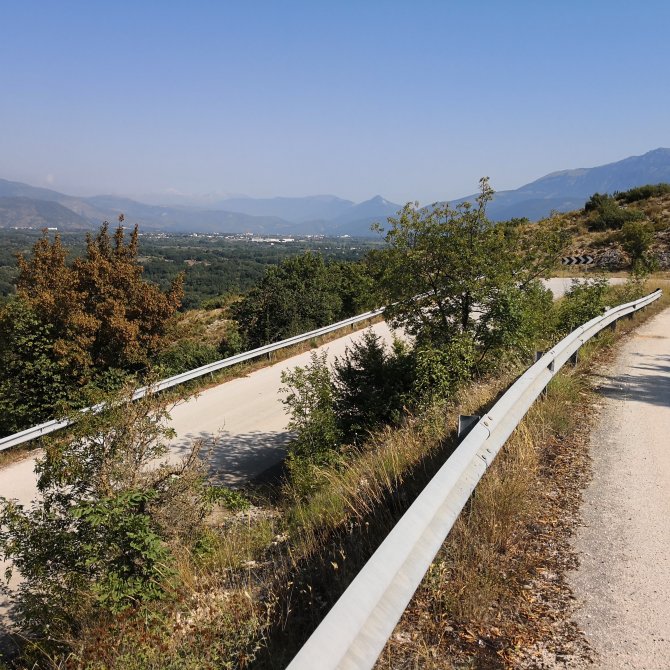 Voor het aankomen in Raiano…. Een recht stuk – op een bijna niet te geloven – trottoir bedekt met een tapijt van dennennaalden, die me doen wegdromen naar een bad met esoterische oliën van den, mijn lijf uitgestrekt met een sfeervol muziekje op de achtergrond, kaarslicht… en- wie weet – iemand met wie ik dit mag delen… nabijheid…. En het geluid van de wagens… Wel die zijn verdwenen….Wegdromen.