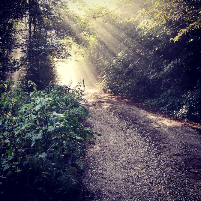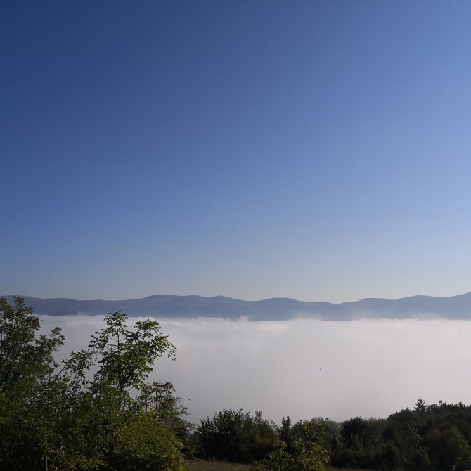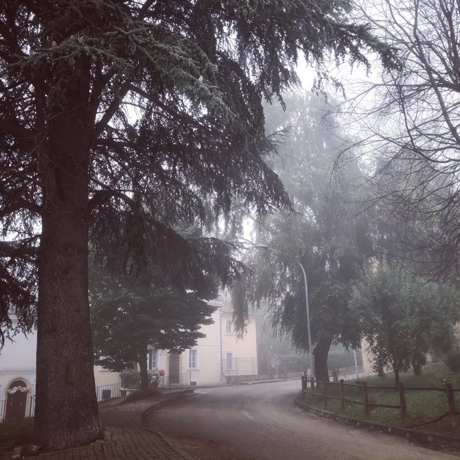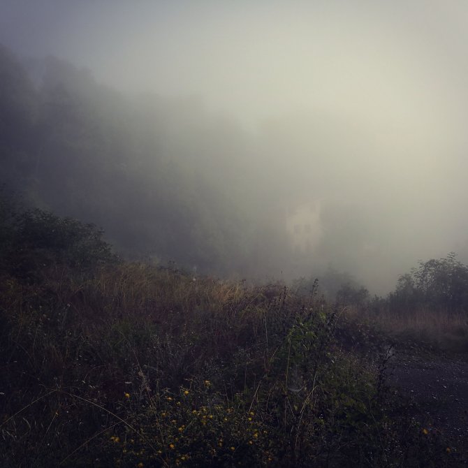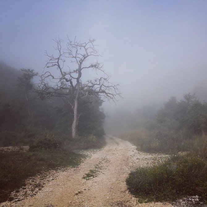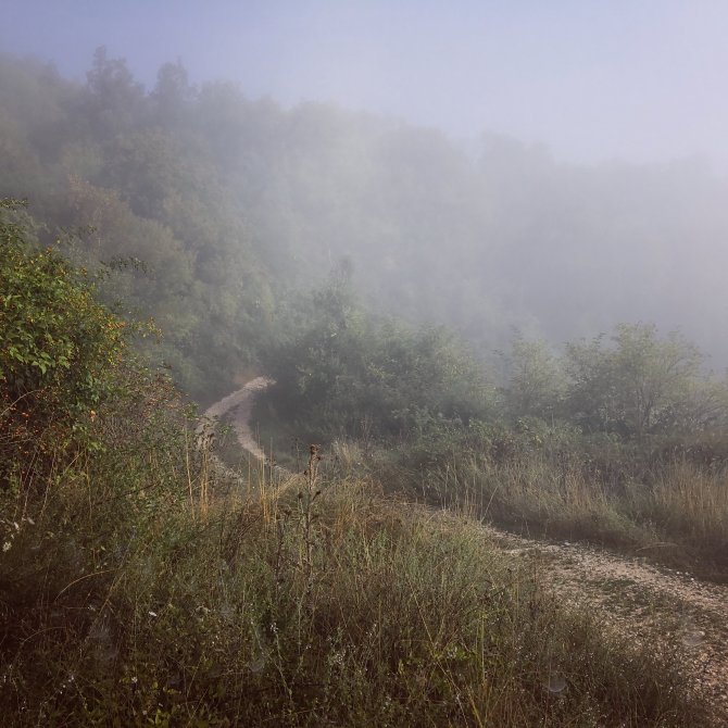 De regen van gisterenavond zorgt voor een dikke mist, van zomer plots in herfstsfeer. Hoewel ik het niet zie, maar wel voel aan de kuiten gaat de weg opwaarts. Ik geniet van de fikse afkoeling.