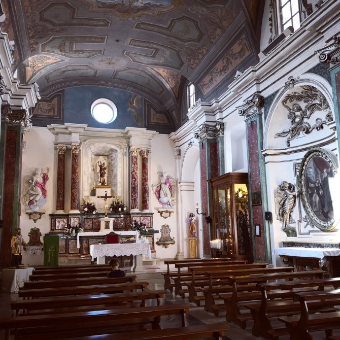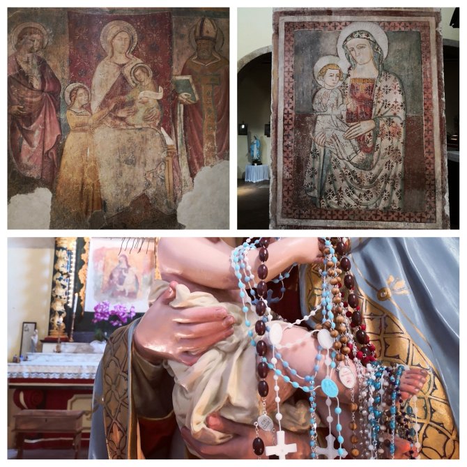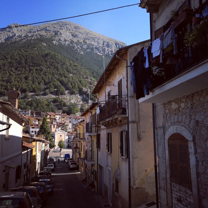 Voor ik de stad verlaat stap ik binnen in een kerk Chiesa di San Michel Archangelo. Een man in roulator weet me te vertellen dat in 2009 de kerk is ingestort tijdens een aardbeving. Het verklaart denk ik een beetje de hedendaagse schilderijen, Aan de ingang van de kerk, op de grond, liggen kranten over politiek en cultuur. Vreemd om dit te zien.