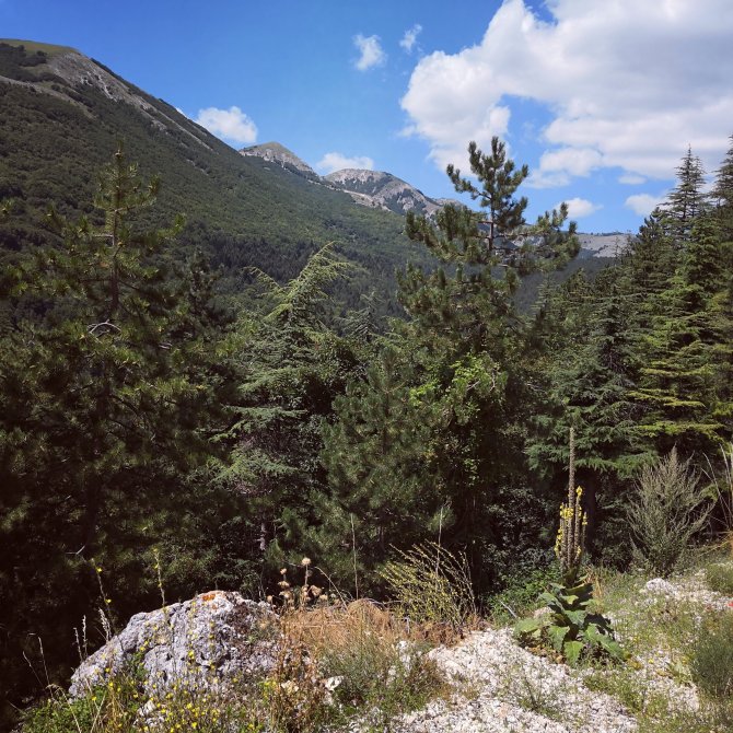 Vanaf Celano gaat het bergopwaarts. Op een rustige asfalt weg afwisselend, op een weg met witte stenen en bospad. Een auto rijd Traag jes achter me aan en claxoneerd. Ik ga wat op de zijkant. De claxon blijft gaan. Op een bepaald moment voelde ik een andere levend wezen achter me. Ik draai me om…. een kleine hond grommend met zijn tanden bloot… “eh, ça va oui…calme toi”… De vrouw in de wagen zegt dat het OK is… “tranquille”… Jah, rustig zeggen ze dan… De vrouw was met de wagen haar hond aan het uitlaten. Al meerdere malen gezien, de leiband wordt vervangen door de claxon, kwestie van het dier wat op te jagen…
