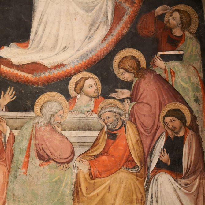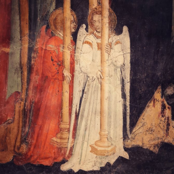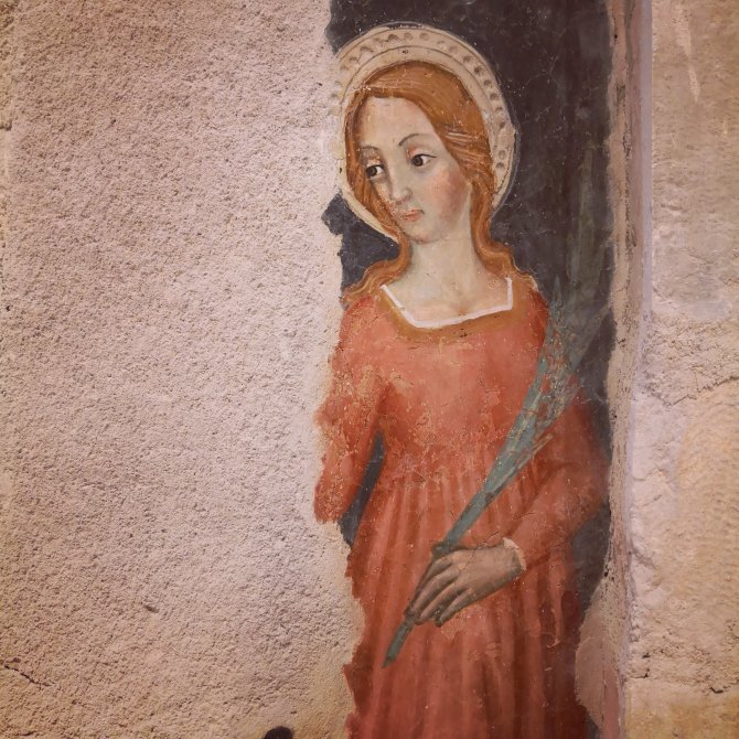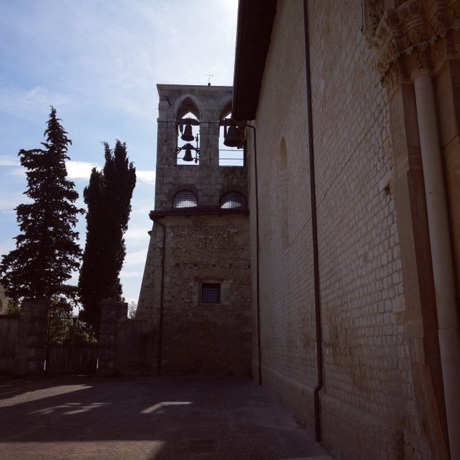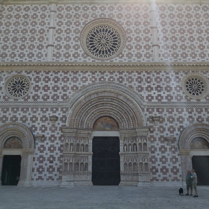 In l’Aquila bezoek ik de Basilica di Santa Maria di Collemaggio die nog niet zolang is gerestaureerd. Een prachtige façade en eenvoudig en sereen intérieur. Prachtige gedetailleerder muurschilderijen. Eentje valt me op… de aertsengel Michael samen met Maria en Jezus, een van de weinige beelden waar ik ze samen zo heb afgebeeld gezien.