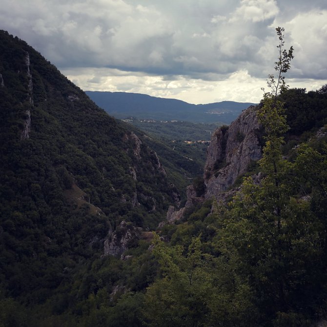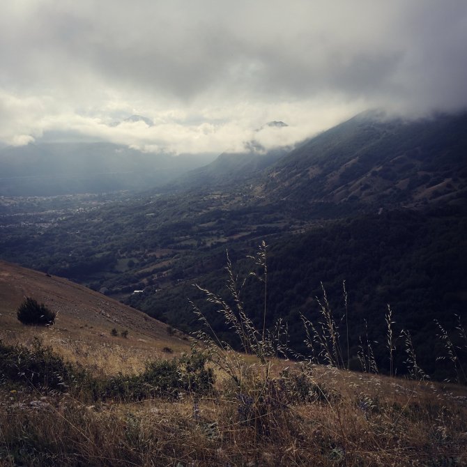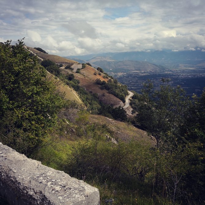 Genietend van de natuur, van de vele vergezichten in de Abruzzo… De laag wolken beweegt met me mee, zoekt zijn weg golvend over de hellingen. Af en toe schijnt de zon op een dorp die ver beneden in het dal ligt.
