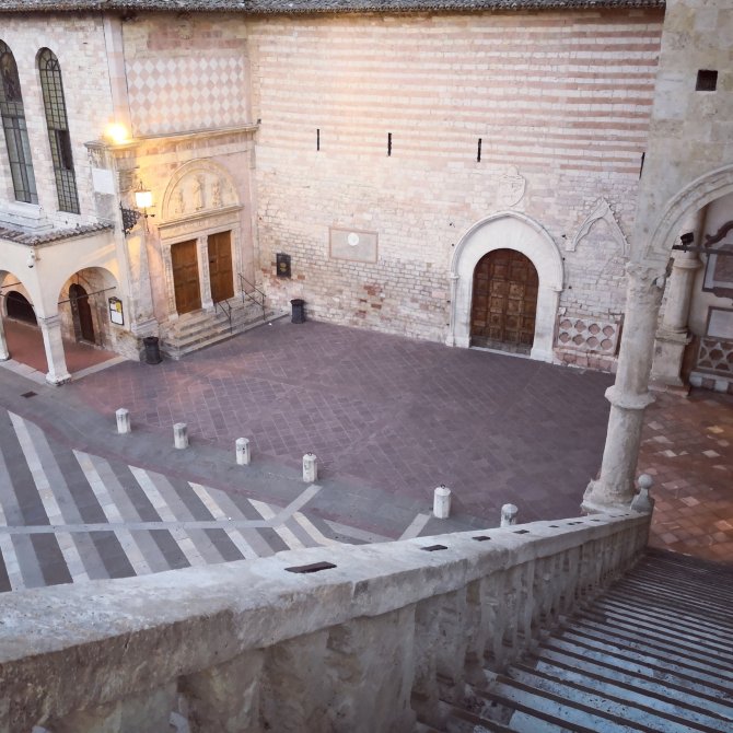 Wachtend op een eerste bar voor mijn ochtend koffie wandel ik wat door de lege straten van Assisi.