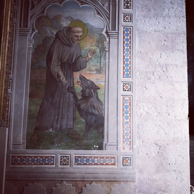 Hier zou Franciscus de wolf hebben getemd door er gewoon mee te gaan praten, nadat het volk bang was geworden van de wolf die al hun dieren op at. Zo werd mens en wolf vriend door elkander te respecteren en zorg te dragen.