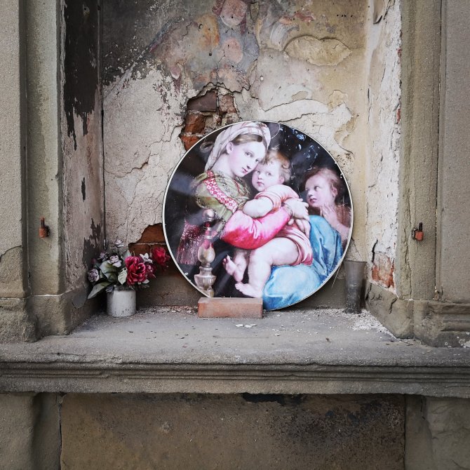 Er rechterover de kerk ‘la confraternita della mesiricordia’. Aan de voorgevel hiervan een olieverfschilderij op doek ‘La carita’… Een broeder die een zieke op zijn schouder draagt…
