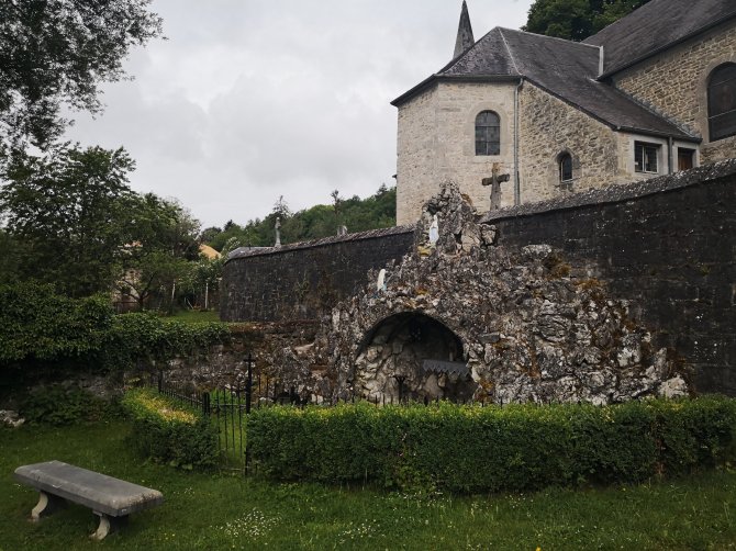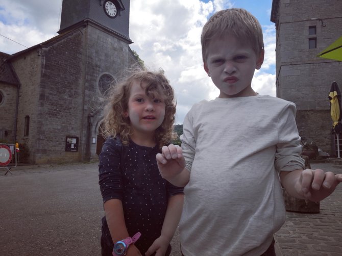 In Vierves-sur-Viroin. Om een hoek, een terras. Yes. Het is altijd zo fijn om even uit te rusten op een terras. Ik ga naar binnen voor een bestelling. Bij het naar buiten gaan hoor ik “Tu a vue c’est chaussures, elle a des doigt pieds”. Hi, ik terug naar binnen. Wat gegeneerd dat ik het hoorde, begint de man wat grappen te maken. We hebben plezier. Buiten spelen 2 kinderen, Natheo et Lea.