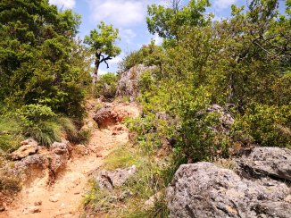 Op een aarde weg midden een brousse zie ik een kruiwagen staan. ‘Een kruiwagen!, een echo in mijn hoofd. Ik keer even terug op mijn passen. Een persoon zit op haar hukje kruid uit te doen. “Bonjourrrr, cela m’ étonne de voir une personne en plein milieu du GR7” Een vrouw, springt recht “Bhein, oui, moi je suis la. Et alors”, op een wat kordate manier. “Pardon madame ce n’est pas une évidence quand en marche depuis des heures dans la nature et que depuis des jours en vois personne en marchons”. De vrouw komt wat dichter en ik voel dat ze zich herneemt. Beginnend met zich te excuseren voor haar klederdracht. Een zwarte onderbroek, een kakihemd. Een fijn gelaat, geblondeerde haren, zwarte getekende wimpers. Uiteindelijk staan we wat te praten. De vrouw is ‘les pyrales’ uit de buxussen aan het halen om te vermijden dat ze verder ziek worden. Want eenmaal de buxussen hun bladeren verliezen kunnen ze niet meer aan fotosynthese doen en sterven ze af.