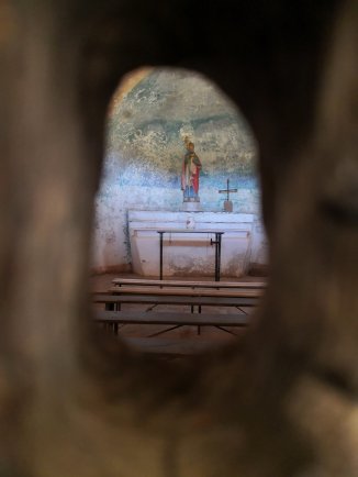 Terwijl mijn tante wat Helicrysum aan het plukken is, wandel ik terug binnen de omheining van de kerk. Een paar kleine natuurlijke stenen staan hier en daar op het kleine kerkhof.
