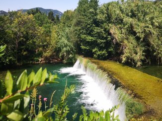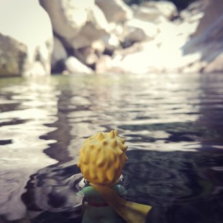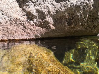 Zigzaggend met de rugzak daalde ik af naar de rivier. Op een rots legde ik mijn rugzak, kleedde me uit. Nam contact met de omgeving. Het water doorschijnend, raakte mijn huid, de wind die zorgde voor lichte golfjes waarop de zon scheen en dansend reflecteerde op de rots. Une couleuvre die wegzwom. De visjes die de huid op mijn voeten wist te appreciëren.