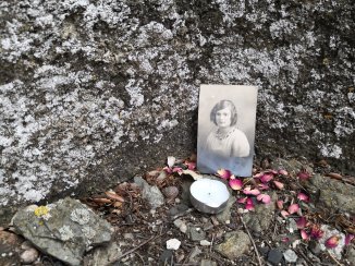 Ik haal een foto van mijn grootmoeder uit, haar roosje en een kaarsje. Ik geef de foto een plaats tegen een muur en strooi de rozenblaadjes uit. Sluit het poortje terug achter mij en strooi de rest uit in de wijde natuur.