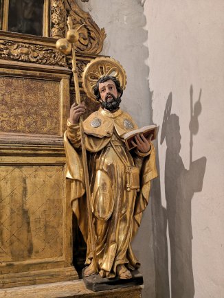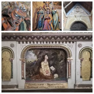 Ik ga verder naar boven. Hmm, nu begrijp ik mijn aanvoelen van toen, waarop ik mocht vertrouwen. Ik wandel door de hoofdstraat verder in stijgende lijn. Hier en daar een winkeltje met allerlei rond spiritualiteit… van boeken, kettingen, hangers in goedkope materie, geurstokjes in allerlei kwaliteiten. Het ene al wat toeristisch dan het ander. Rechts een smal pad brengt me mee naar de Maria Magdalena kerk. Boven de deur, geschreven teksten in Latijn aan de ingang een opvallend beeld van een duivel. Er boven vier engelen elk vormt een verschillende beweging die samen het kruisteken vormen. Een kleine aangename kerk, met veel Kitch taferelen met hier en daar symbolen die men niet op andere kruiswegen terug vind. Ik blijf er een eindje zitten om gewaar te worden. Niets bijzonders. Het is.