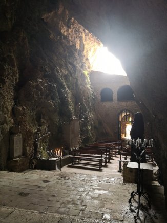 Tussen hier en daar bezoekers is het er zalig vertoeven in rust. Mijn boekje, aquarel, een penseel… een eenvoudige schets.Verder op het pad van de Ermitage, een ingang. ‘La grotte de Galamus’ . Een klein donker gat in de wand, amper heupbreedte, smaller in de hoogte. Het ziet ernaaruit dat ik erdoor kan, de wand is gladgestreken. Het maakt me nieuwsgierig. Ik vraag even raad aan de jongen die het onthaal doet. “Oui, vous pouvez y rentrez. Vous avez une torche ?” “Oui, j’ai ma lampe de mon téléphone”. Ik laat mijn rugzak bij het onthaal.