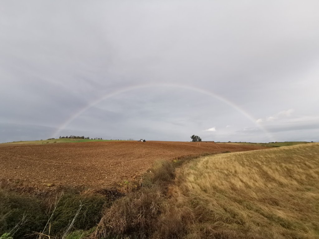 De paarse kleur van Lavendel, het roze van de Silène armeria, witte, gele voor mij onbekende mini bloempjes…. Simplement ‘un mariage parfait’. De regenbuien brengen avontuur op de weg. Overlopende beekjes of grote plassen zorgen voor extra blaren aan de voeten van de pelgrims. Regenbuien brengen ook prachtige regenbogen en tovert kleur in de donkergrijze lucht. En de ene dag houd de regen niet op, terwijl de andere dag druppels vallen en dankzij de hevige wind onmiddellijk drogen nog vóór ze zich kunnen nestelen in de wand van mijn regenjas.