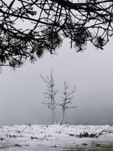 Samen met Thea begon ik aan de klim. Wat op een heldere dag een weids, open landschap zou zijn geweest, werd nu een afgesloten, grijze wereld. Boven op de berg verraste ons een sneeuwstorm. De lucht sloot zich, tijd en ruimte vervaagden. Sneeuw veranderde door de snijdende wind in scherpe ijskristallen die mijn linkerwang geselden. Het wit van de sneeuw bestond niet meer — alleen eindeloos grijs. En elke zeldzame lichtstraal die doorbrak, verblindde me.