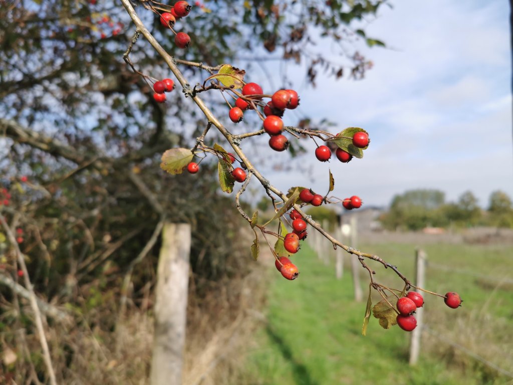 Op de achtergrond hoor ik een gans, een woonst is nabij. De vruchten van de wijnranken werden reeds geplukt en staan er verlaten bij, de kleur rood is te zien aan de toppen van de bladeren. .