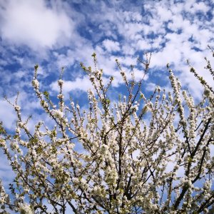 Witte bloemblaadjes dwarrelen zacht heen en weer om te gaan liggen op een grijze harde ondergrond. Natuurlijke confettis.