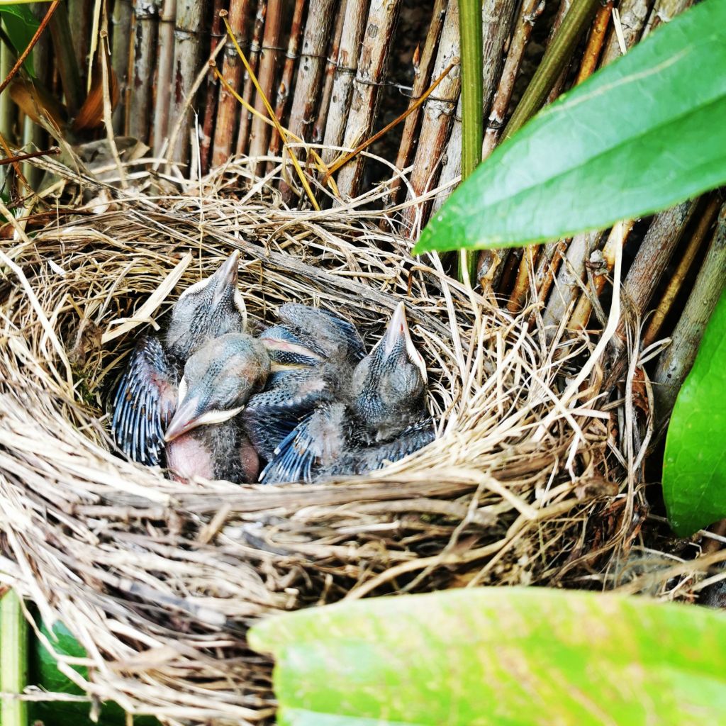 Toen ik als laatste vertrok uit de ‘White Rabbit’, daar waar ik samen met mijn zusters en broeder verbleef en ook waar we onze groepssamenkomst hadden hoorde ik boven mij plots een getsielp van drie pasgeboren vogels.