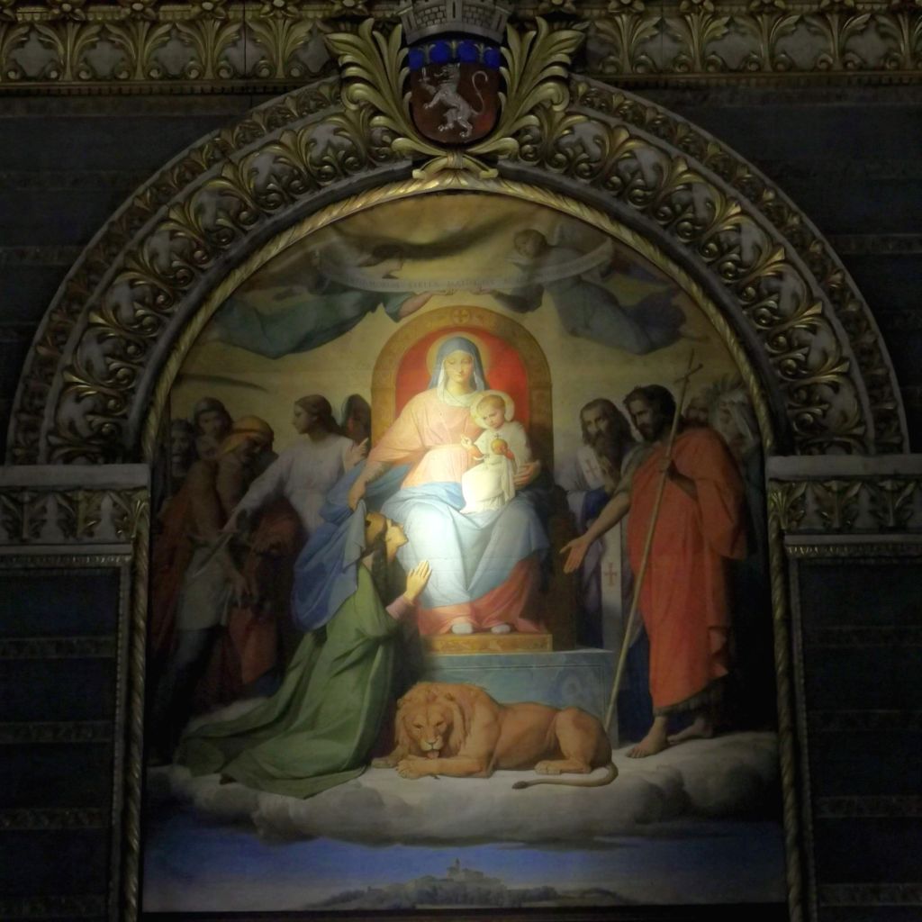 Één ander huisnummer, 11 trok mijn aandacht. Tussen tal van graffiti stond in mooie kalligrafische letters: “Jeanne”. Een duif vloog voor me uit op de trappen. Boven aangekomen stapte ik de Basiliek binnen. Het voelde er goed en ik bleef er wat rondhangen. Een glasraam trok mijn aandacht bij de zachte witte en gouden tinten. Links een engel, vermoedelijk aartsengel Michael, een vrouw, een zwaard met lichtbundel onderaan, omringd door vuur, en een ster erboven. Rechts een andere vrouw, een engel met de staf van een pelgrim in zijn handen.