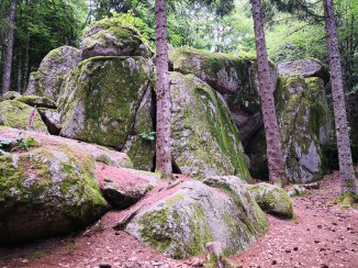 In een bos… het is er muisstil. Naaldbomen en grote rotsen. Verschillende energieën zijn er voelbaar. Harteklop… ik wacht en geef mijn lichaam de tijd om de omgeving op te nemen. Heel traag wandel ik rond. Ik neem contact met een rechtstaande kolossale rots… Het voelt zacht en gedragen.