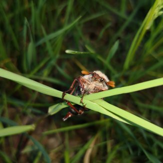 Een koppelende meikever vliegt op mijn rugzak. Allé, voor wat nog leeft. De ene is al dood terwijl hij nog vast hangt aan de andere. Ongelofelijk hoe krachtig die insecten zijn.