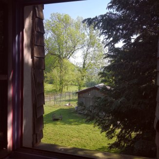 Ik open het raam van de badkamer. Vogelgezang. De zon. Groen. Rust.