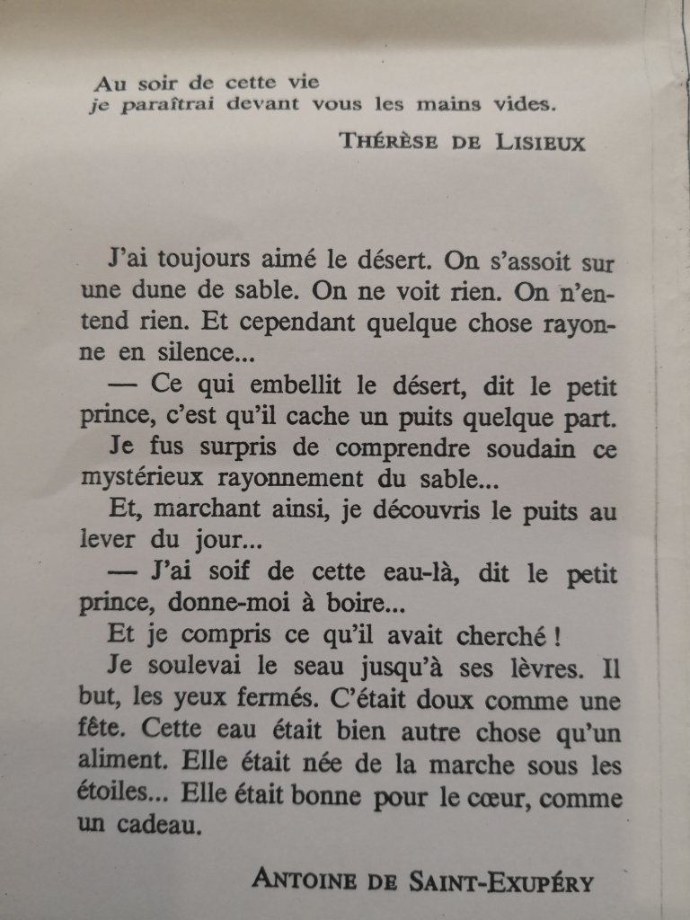 Liefste JASMINE, bij het openen vandaag van het boek van C. De Meester op een boodschap van Thérèse de Lisieux, ben ik geraakt bij het lezen van een citaat van de Kleine Prins, vóór de introductie, die me aan jou deed denken en aan wat je beleeft van dag op dag…