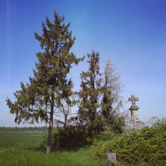 Een verloren kruis ten minden de velden. Herdenking. Een spinnenweb. Een vliegtuig. Een buizerd neemt een rechte duik naar beneden.